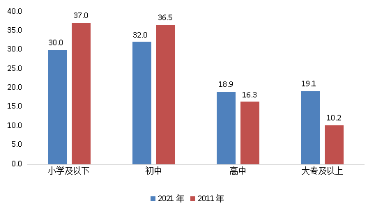 高学历人口占比持续提高。在15周岁及以上人口中,具有大专及以上文化程度人口占比由2011年的10.2%提高到2021年的19.1%,提高8.9个百分点;高中文化程度人口占比由16.3%上升到18.9%,提高2.6个百分点;初中文化程度人口占比由36.5%下降到32.0%,下降4.5个百分点;小学及以下文化程度人口占比则由37.0%下降至30.0%,下降7.0个百分点。总体上呈现出高学历人口占比显著提升,低学历人口占比下降的趋势。