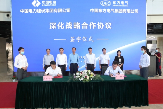 东方电气集团党组成员、副总经理李忠军与公司总经济师刘明江代表双方在深化战略合作协议上签字。