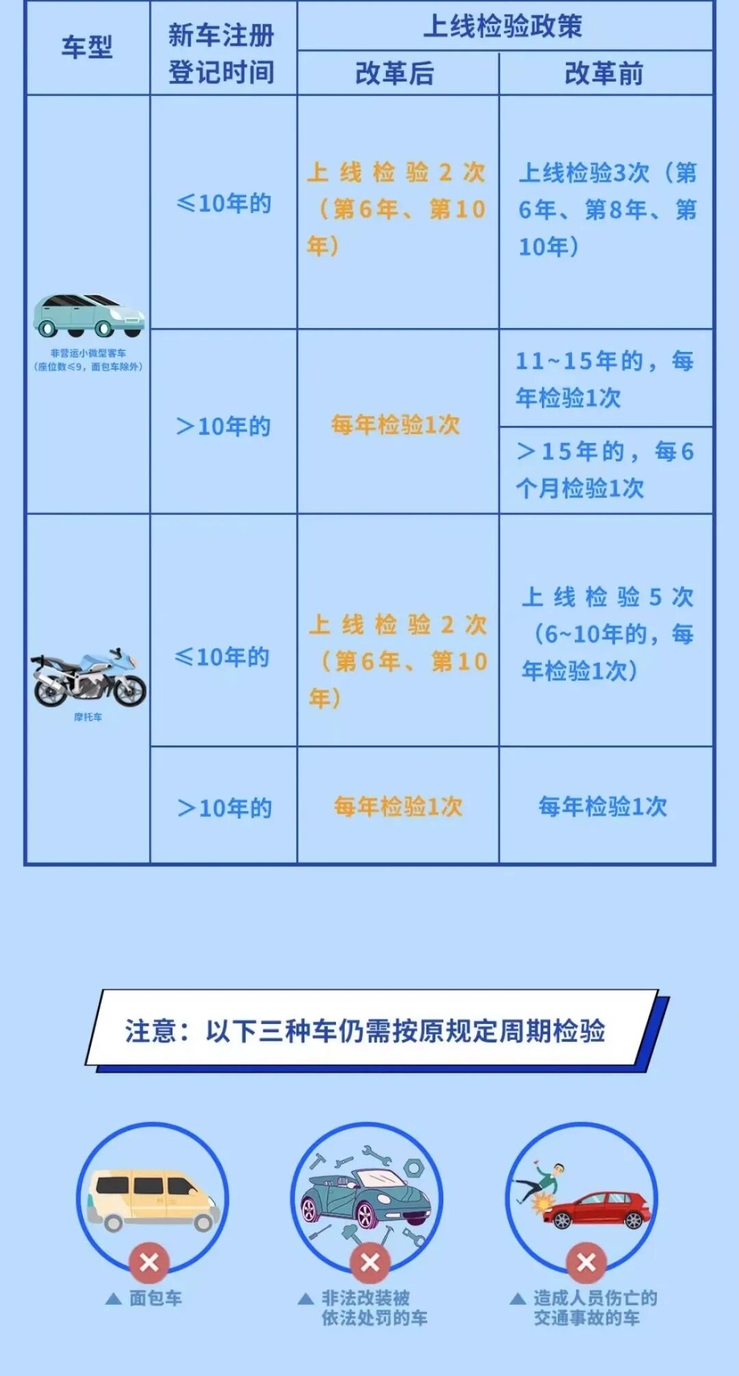 记者了解到,非营运小微型载客汽车、摩托车自注册登记之日起第6年、第10年进行安全技术检验的,可以在10年内每两年就向县公安交管部门申领检验标志;超过10年的,则需要每年检验1次,并向公安交管部门申领检验标志。