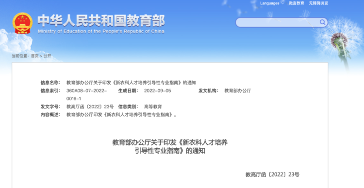 记者9月19日从教育部了解到,为引导涉农高校加快布局建设一批具有适应性、引领性的新农科专业,加快培养急需紧缺农林人才,提升服务国家重大战略需求和区域经济社会发展能力,教育部日前印发《新农科人才培养引导性专业指南》,将生物育种科学等12个专业列为新农科人才培养引导性专业。