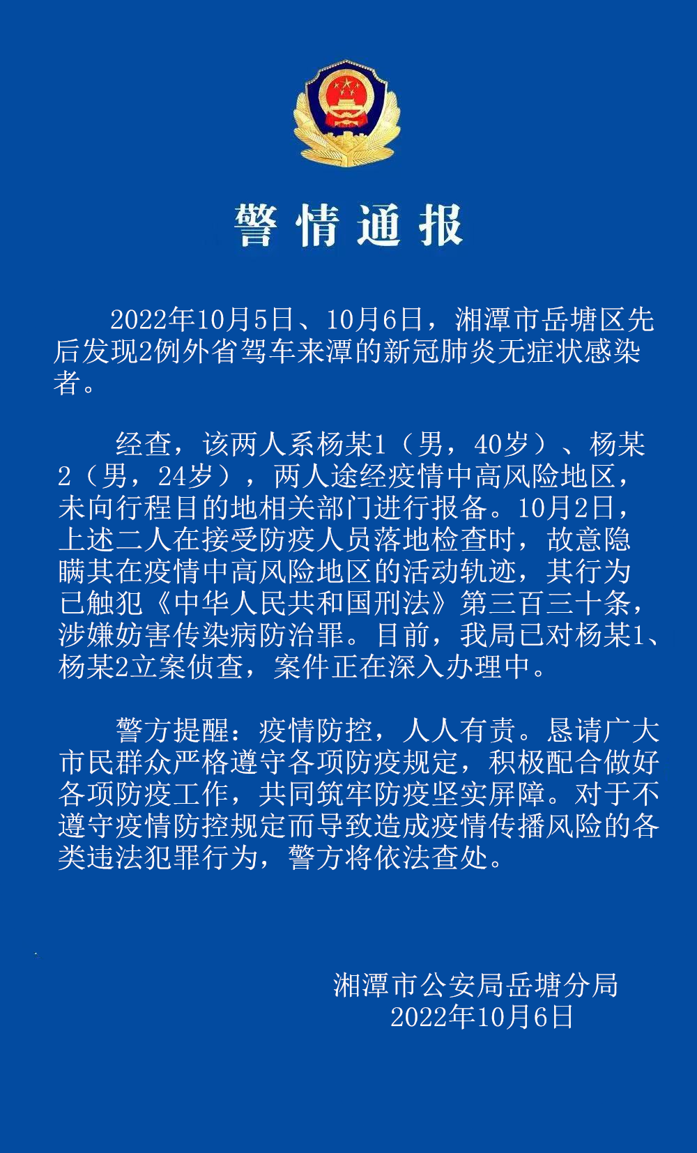 2022年10月5日、10月6日,湘潭市岳塘区先后发现2例外省驾车来潭的新冠肺炎无症状感染者。