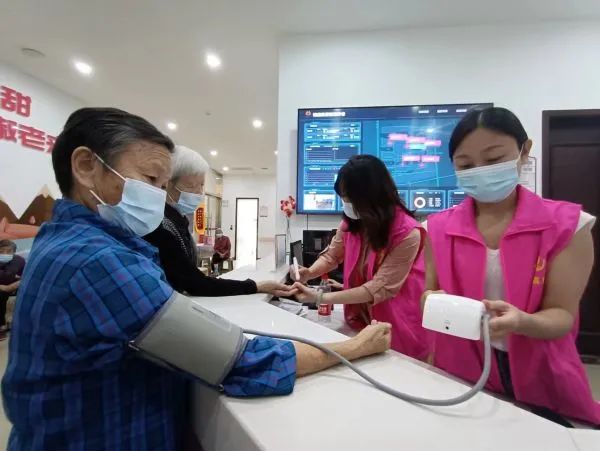 △在社区养老服务中心,工作人员正在为老人测量血压。