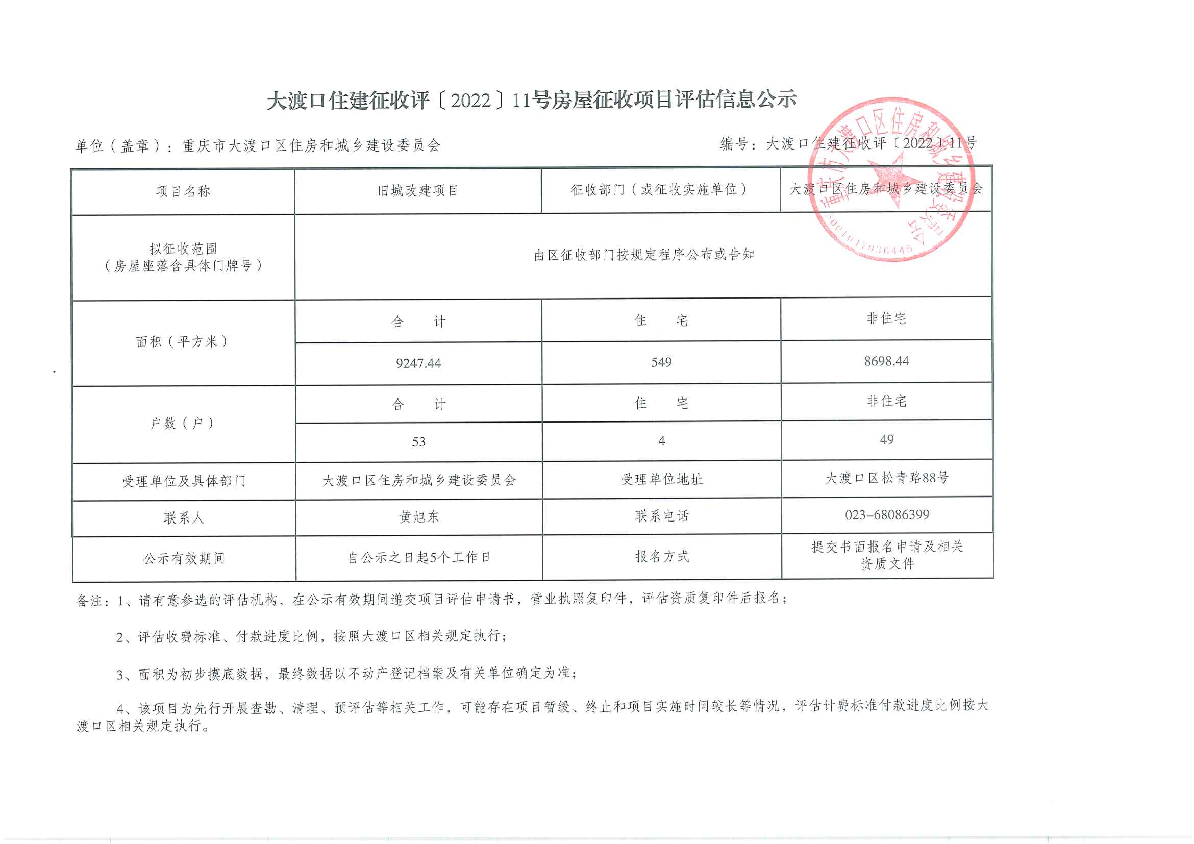 大渡口住建征收评〔2022〕11号房屋征收项目评估信息公示