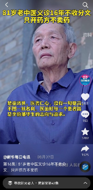 81岁的老中医李伯藩,婉拒高薪邀请,16年如一日开展义诊,门庭若市,却不收分文,因为他只开药方不卖药。没有一句豪言,不图一丝名利,医治好每一个患者就是李伯藩毕生的志向与追求。网友评论:“真正的医者仁心”。