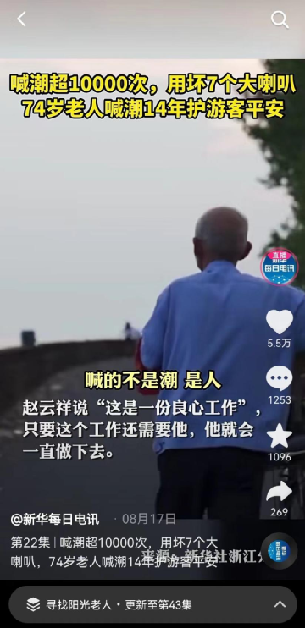 76岁的赵云祥老人在钱塘江边守护喊潮已经14年了,1万多次“喊潮”。在日复一日“潮来了”的呼唤声中,他用坏了7个大喇叭,只为确保这片壮观的潮水不会伤到人。“闲不住,想着多为社会出一份力。”赵云祥说。网友评论:“您喊的是万家安宁”。