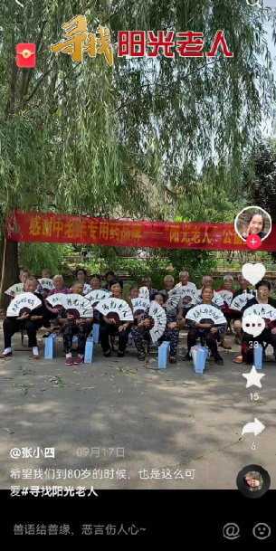 抖音博主@张小四今年才33岁,但是她的视频里记录的,都是自己村里的老人。老人们一起怀抱辣椒、玉米等农产品走秀,还跟着音乐唱歌跳舞,老人们积极阳光的生活面貌在抖音收获了354.7万点赞。据了解,参与视频拍摄的老人共有40多位,年龄最小的70岁,最大的103岁。网友们纷纷留言:“爷爷奶奶太可爱了”。