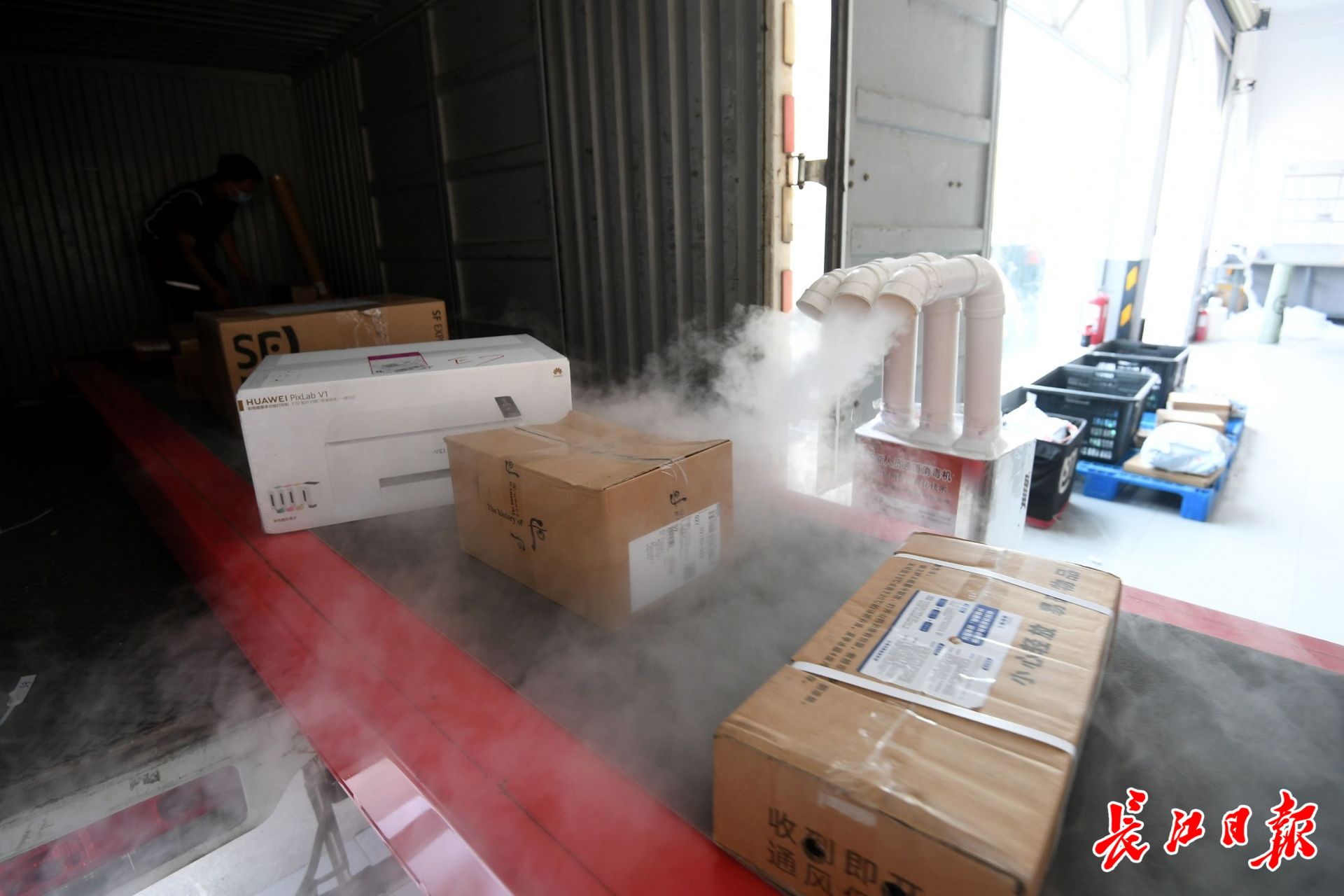 说话间,一辆满载快件的货车停在网点门前,工作人员通过传送带对快件进行分拣,每个快件入库前,都会通过消杀喷雾进行“六面消杀”,不到十分钟,一车快件就完成了消杀分拣,各片区快递员将分拣的快件装上电动三轮,准备前往各小区派件。