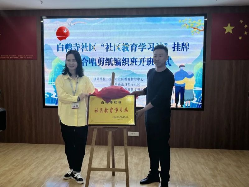 现场,枝江市职业教育中心党委副书记、校长、市社区教育中心总牵头人黄兆双为白鸭寺社区教育学习站授牌,白鸭寺社区党委书记、居委会主任柳王洪为志愿者教师颁发聘书。