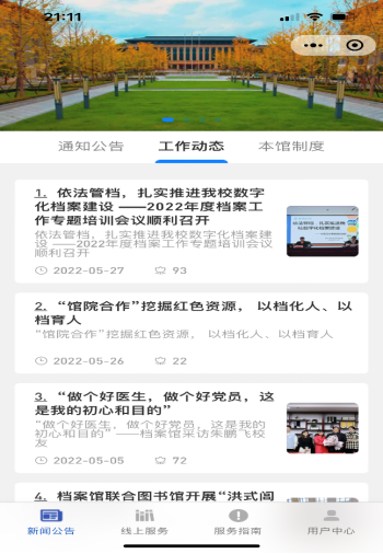 微信小程序是档案馆移动端服务平台,具有简明便捷等特性。小程序的信息和用户数据与网页平台共享,主要实现校友远程查档、工作动态、通知公告、校史馆参观预约(暂未开放)等功能。