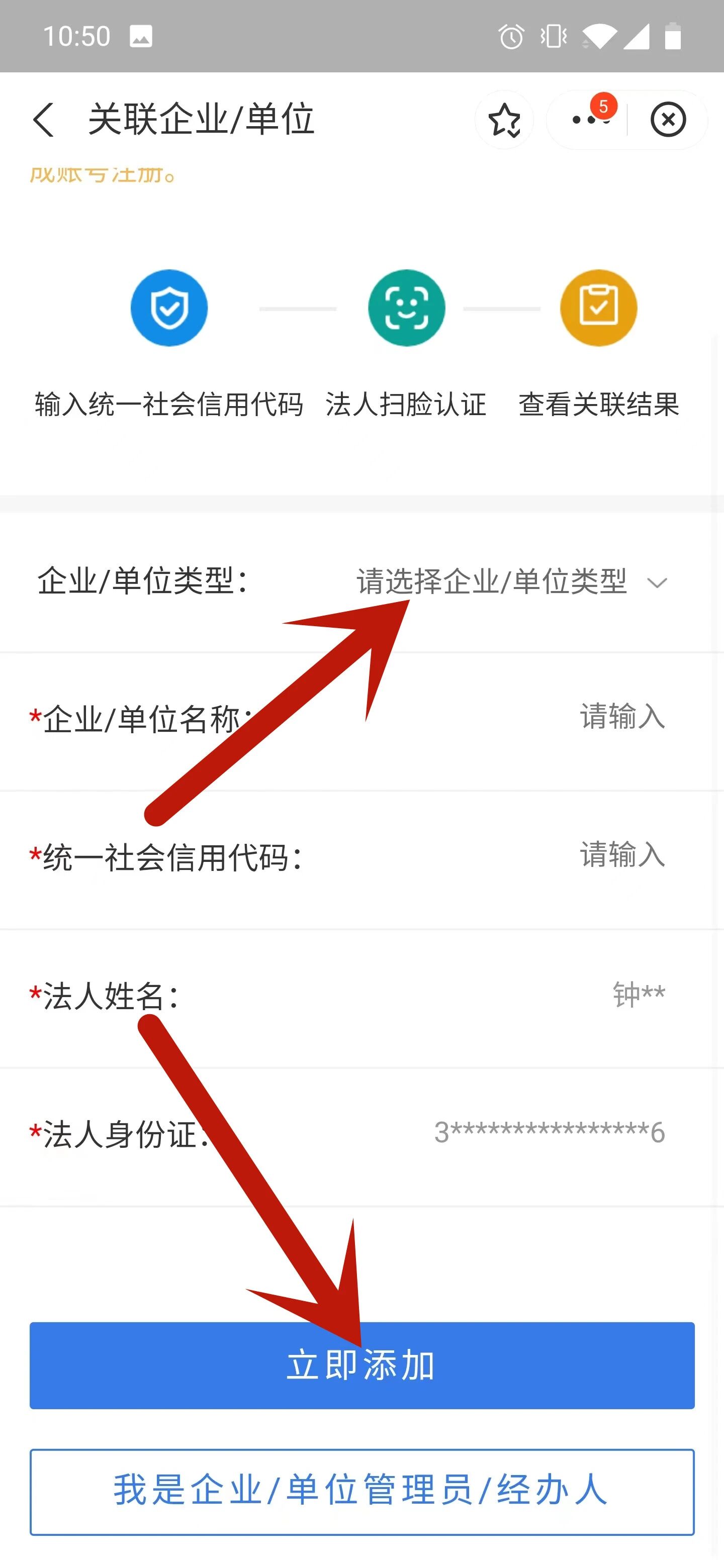 3.选择企业类型,按要求填写信息,并点击立即添加,完成法人扫脸认证