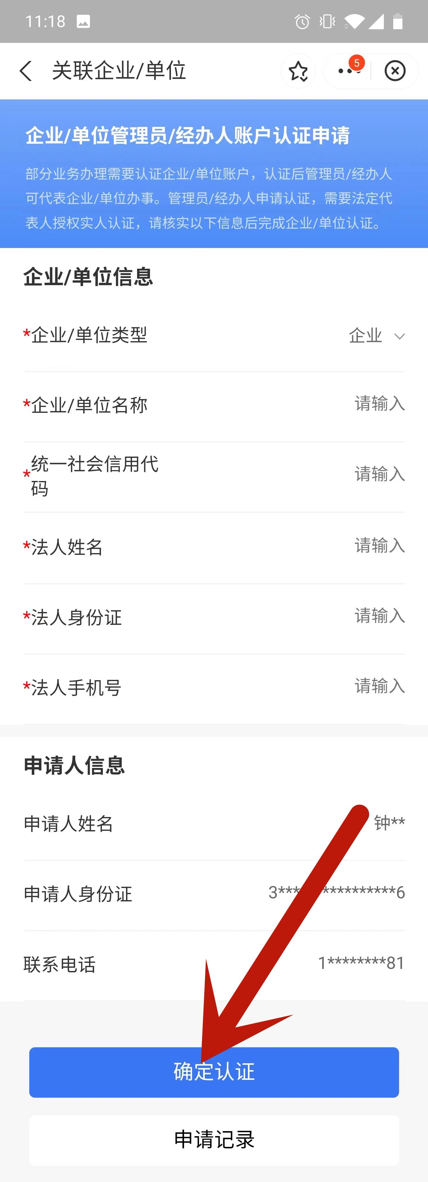 4.如果是管理员/经办人办理,则选择下方企业/单位管理员/经办人按钮,并按要求填写信息,将法人认证页面分享至法人的支付宝或微信完成认证