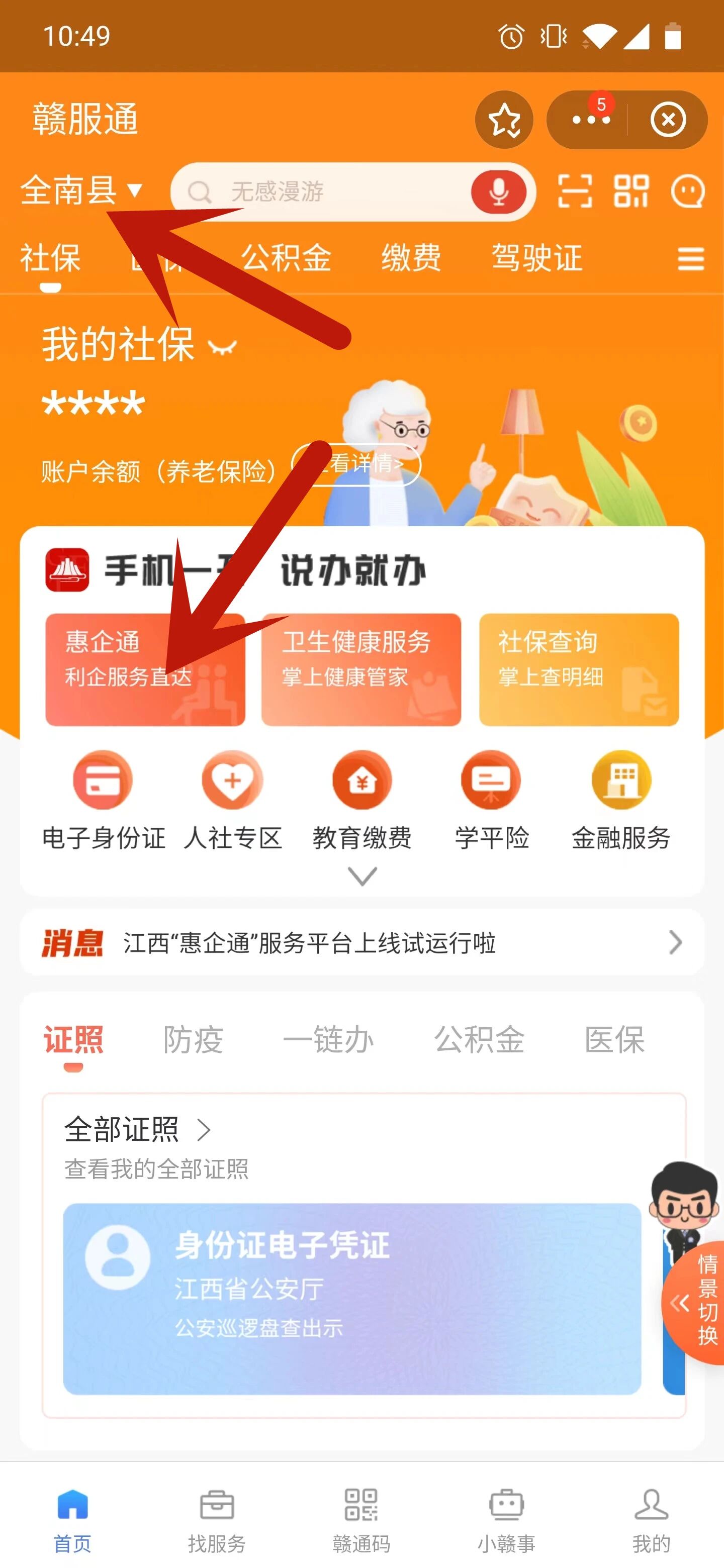 1.通过“赣服通 APP”或支付宝“赣服通”小程序,定位到”全南县“或手动选择”全南县“,进入惠企通平台
