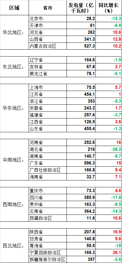 增速为正的17个省区中,宁夏回族自治区增幅最大,达26.1%。其他发电量增速超10%的地区还有7个,按增幅由大到小依次为:陕西省(16.9%)、河南省(16%)、广东省(15%)、山西省(12.8%)、河北省(10.6%)、西藏自治区(10.6%)、内蒙古自治区(10.2%)。