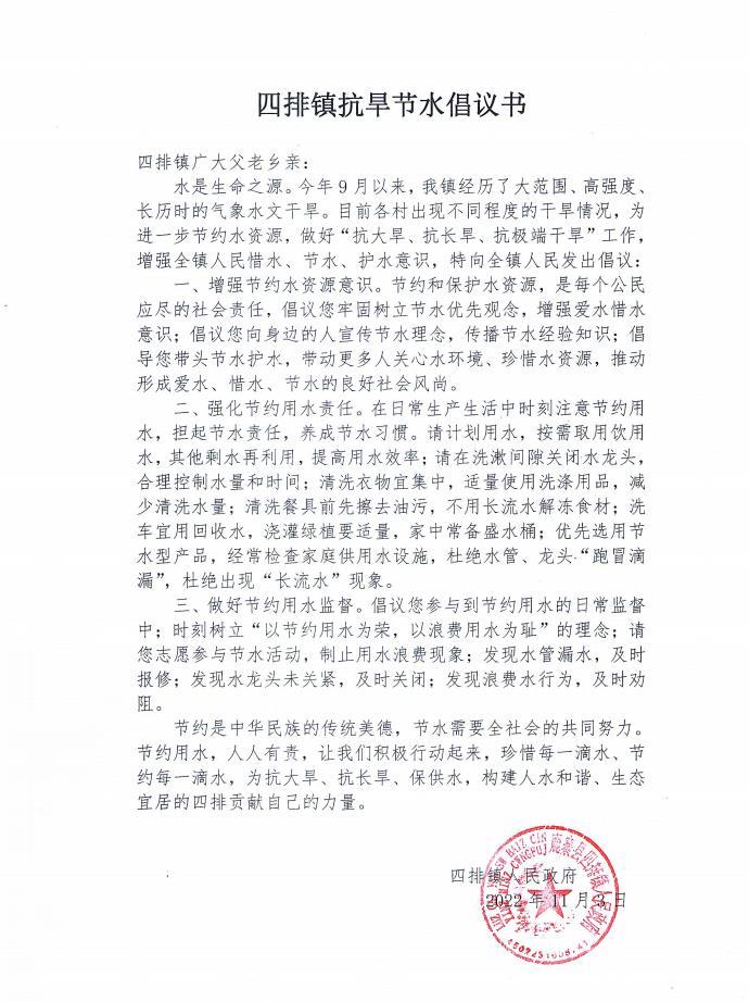 加强宣传教育,开展“节水”宣传。充分发挥“网格化”等基层治理体系作用,通过村民小组长进村入户、微信工作群、朋友圈、村级广播等方式开展宣传引导,发放《四排镇抗旱节水倡议书》、宣传生活节水常识,倡议广大群众增强节约水资源意识,让更多人关心水环境、珍惜水资源,推动形成爱水、惜水、节水的良好社会风尚,增强全镇人民惜水、节水、护水意识。