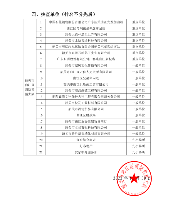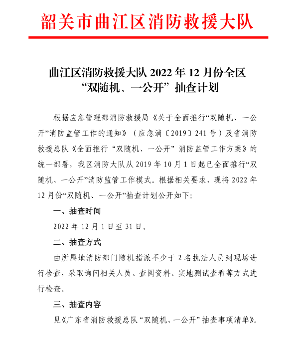 曲江区消防救援大队2022年12月份全区“双随机、一公开”抽查计划