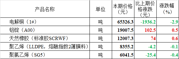 其中,和电缆原材料相关的5大产品中,和上期相比,除铝锭(A00)、天然橡胶价格继续上涨意外,电解铜(1#)等价格均下跌。