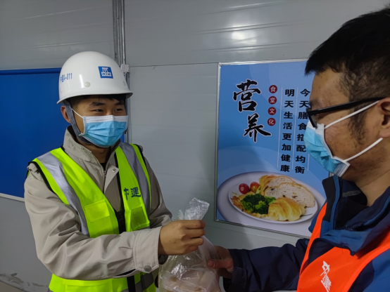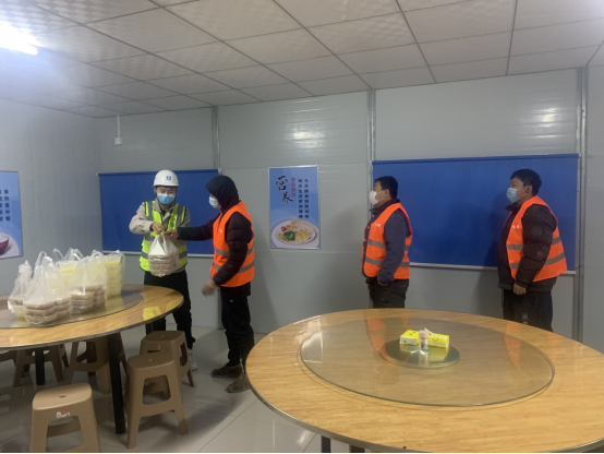 在近期疫情对餐饮业造成较大冲击的情况下,项目部的工人们遇到了吃饭难、吃饭贵的问题,项目经理董阳在了解到此情况后,第一时间组织有关部门进行商议,并在综合评估后决定由项目部食堂为广大工友提供一日三餐。