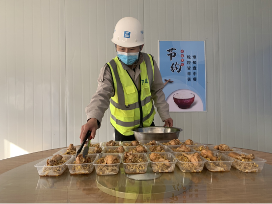 “红烧肉出锅!可以装盒了!”伴随着食堂主厨嘹亮的嗓音,工作人员们开始紧锣密鼓地装盒作业。为确保工友吃饱、吃好,项目部明确了“有荤有素、管饱管够”的工作标准,不仅保证工友们天天有肉吃,还准备了各类营养均衡的水果。同时,项目部严守疫情防控底线,以打包装盒的方式为工友提供餐食,避免了人员密集风险,成功解决了五十多名工友的吃饭难问题。