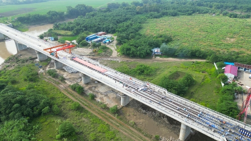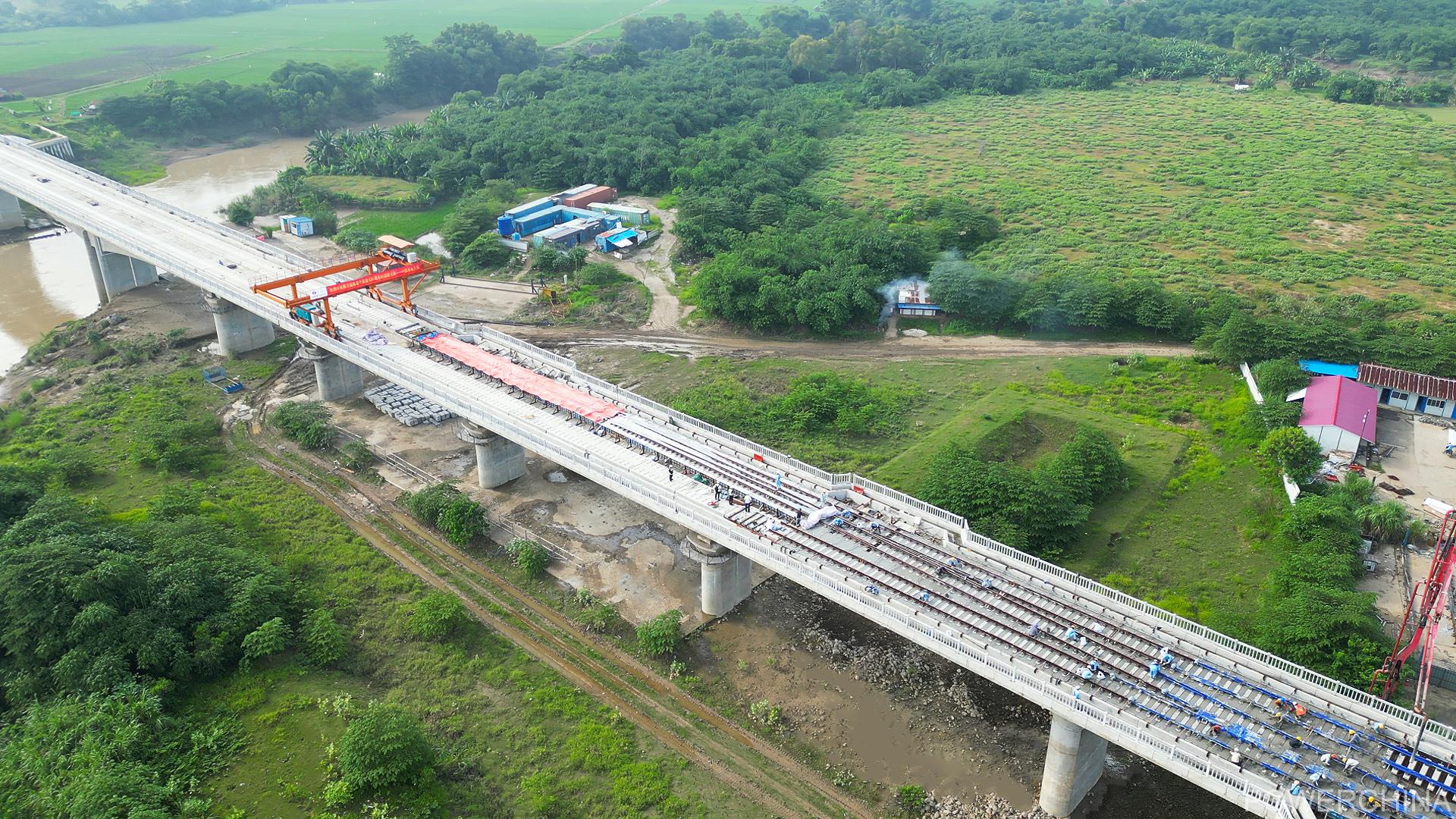 该高速无砟道岔位于DK40+188处,为桥梁地段二组18号单渡线道岔,设计时速350公里。高速无砟道岔作为轨道铺设工程中的复杂部件,组装、铺设精度要求高,雅万高铁项目部克服雨季和交叉作业影响,严格执行高速无砟道岔铺设首件工程施工技术标准,加强施工工艺管理、精细化作业,精度满足验收标准,确保列车通过的可靠性、平顺性。