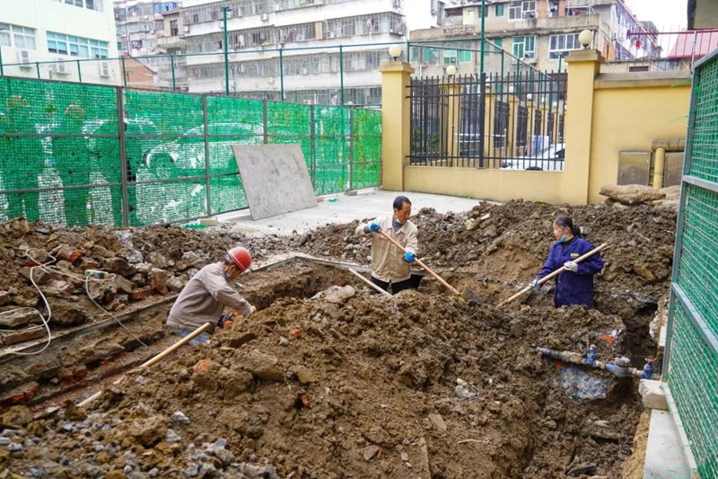 走进新民街小学宿舍2号楼,一群施工人员正在紧锣密鼓地打坑、铲土,为即将加装的电梯基坑打好基础,小心翼翼、干劲十足。