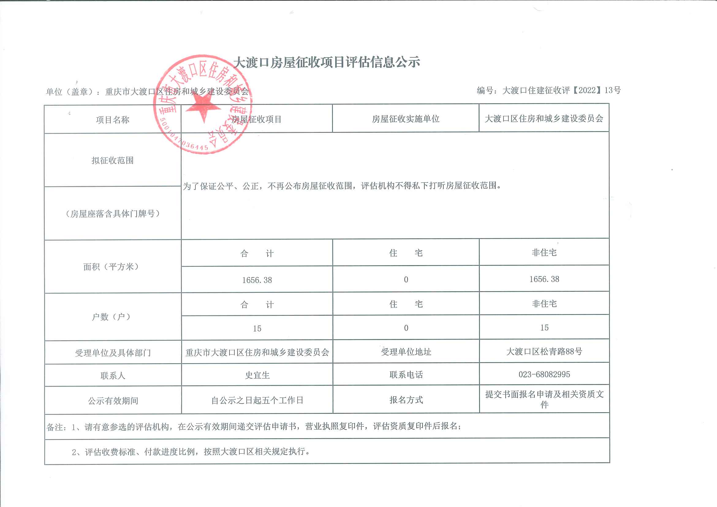 大渡口住建征收评〔2022〕13号房屋征收项目评估信息公示