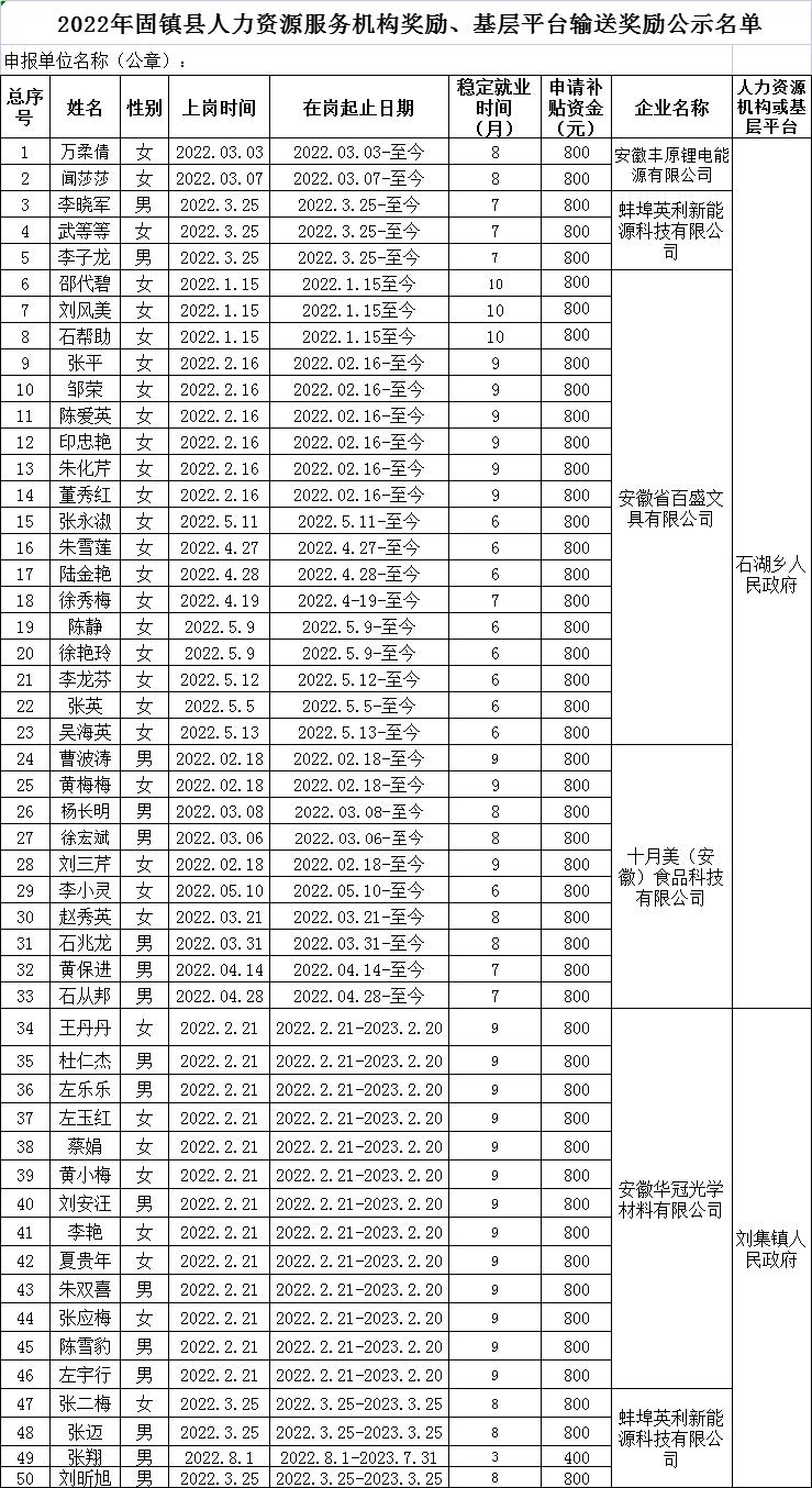 关于2022年固镇县基层平台、人力资源服务机构服务企业用工奖励资金的公示