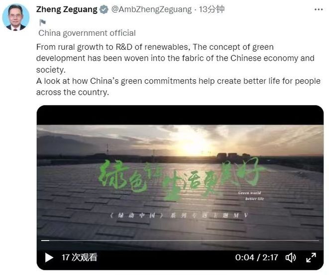 12月24日,中国驻英国大使郑泽光在其推特账号上转发了澎湃新闻(www.thepaper.cn)此前制作的《绿动中国》“绿色让生活更美好”主题MV。