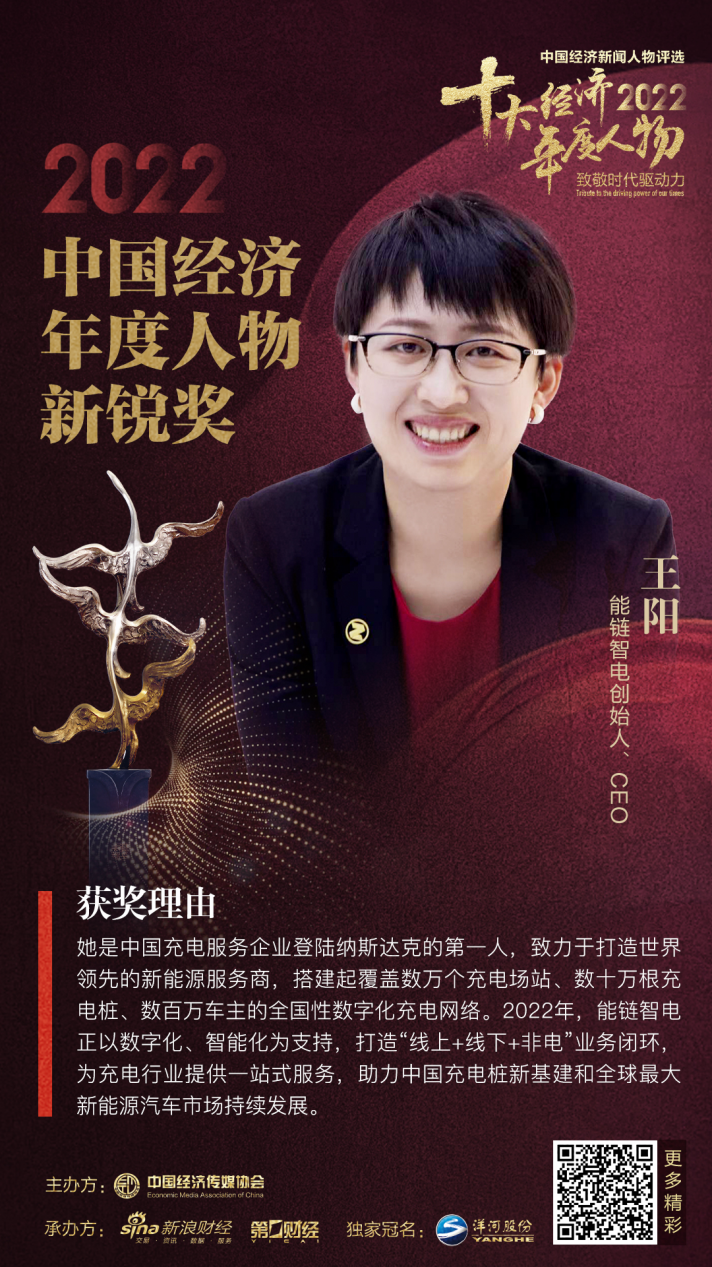 该评选由中国经济传媒协会主办,新浪财经、第一财经、吴晓波频道联合承办。评委会给王阳的颁奖词写道:“她是中国充电服务企业登陆纳斯达克的第一人,致力于打造世界领先的新能源服务商,搭建起覆盖数万个充电场站、数十万根充电桩、数百万车主的全国性数字化充电网络。2022年,能链智电正以数字化、智能化为支持,打造‘线上+线下+非电’业务闭环,为充电行业提供一站式服务,助力中国充电桩新基建和全球最大新能源汽车市场的持续发展。”