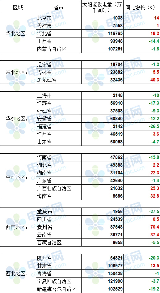 11月份,我国仅有贵州省的太阳能发电量同比增幅超过了50%,达70.4%。