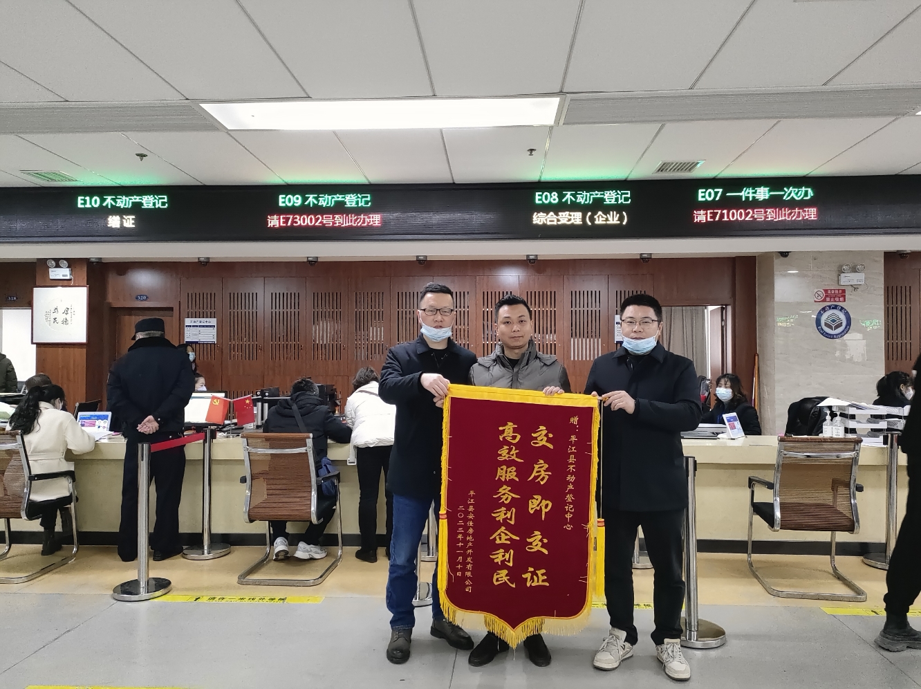 1月11日上午,平江县颐华大江投资有限公司送来“交房即交证,创一流营商环境”的锦旗,感谢县不动产登记中心为颐华城继第一期“学府里”交房即交证后,高效服务第二期“翡翠湾”交房即交证,这是该中心第6次收到此类锦旗。