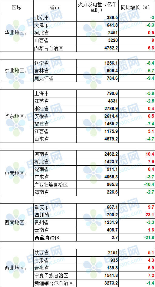 此外,东北三省累计火力发电量依旧同比全部下降,继续成为我国唯一所有省区累计火力发电量全部同比下降的地区。
