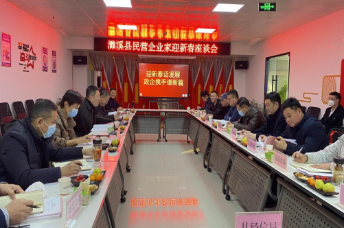 1月10日下午,濉溪县经信局组织县重点民营企业家代表在县新经济产业园淮海壹号召开民营企业家迎新春座谈会,会议听取民营企业家代表对当前濉溪县民营经济工作做法看法、意见和建议,其目的是进一步坚定信心,鼓足干劲,凝聚力量,推动全县民营经济高质量发展。副县长鲍锐,
