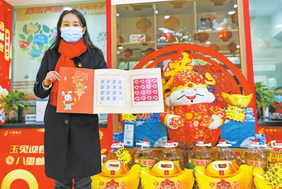 1月10日,大足区邮政局的工作人员正在展示《癸卯年》特种邮票。2023年是癸卯兔年,中国邮政发行《癸卯年》特种邮票一套2枚,图案名称分别为“癸卯寄福”“同圆共生”。 新渝报记者瞿波实习生曾亦嘉摄