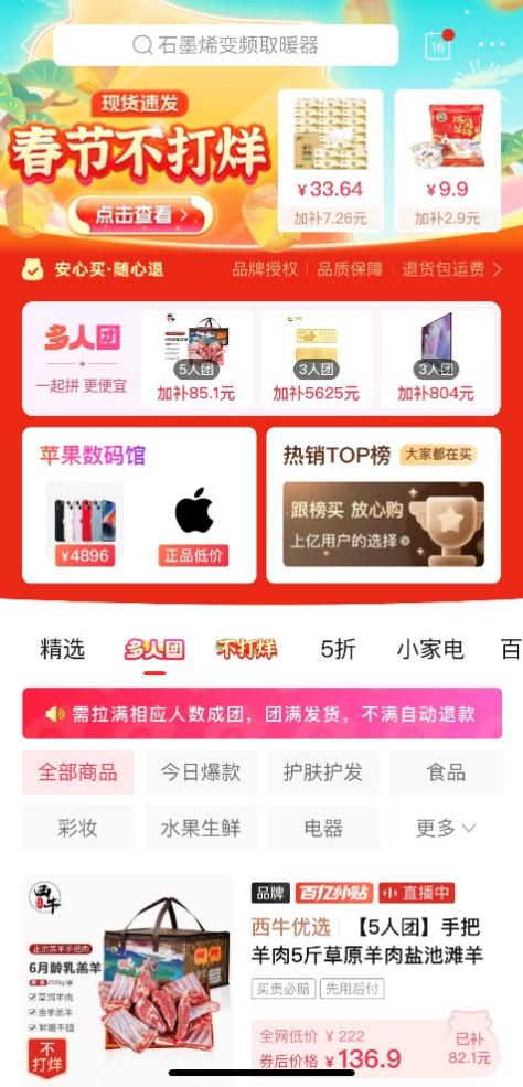 为了给春节亲友聚会增添更多的温情时刻,“春节不打烊”会场还特别上线了“多人团”的玩法,邀请三至五位亲朋好友即可开团,不仅可以“一键拼购”各类优质年货,还能享受更实惠的价格。