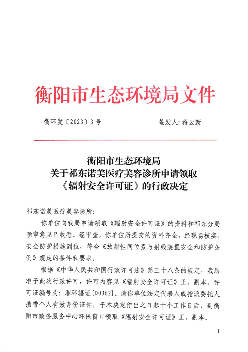 关于祁东诺美医疗美容诊所申请领取《辐射安全许可证》的行政决定
