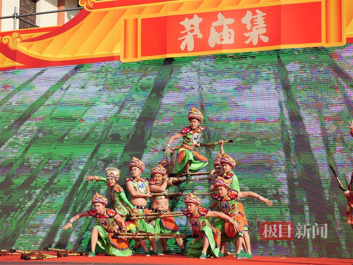 看,一台大型演出正在上演,咸丰县南剧《唐崖土司夫人》、土家高腔山歌、唢呐演奏等悉数登场,精彩表演沸腾集市。