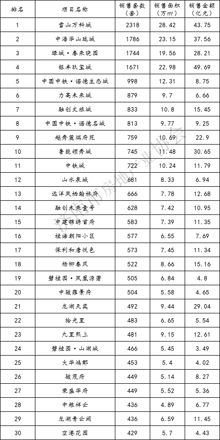 本次排名,对目前市场中合作开发的项目,企业销售业绩以企业股权占比来计算。前30名企业销售金额908.15亿元,占全市商品房销售总额的50.77%(2021年为52.22%);前30名项目销售金额519.75亿元,占全市商品房销售总额的29.06%(2021年为32.28%);前30名项目销售面积359.91万平,占全市商品房销售面积的24.51%(2021年为26.05%);前30名住宅销售金额441.2亿元,占全市住宅销售总额的31.84%(2021年为36.82%);前30名住宅销售面积299.03万平方米,占全市住宅销售面积的30.57%(2021年为30.14%)。
