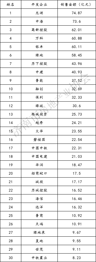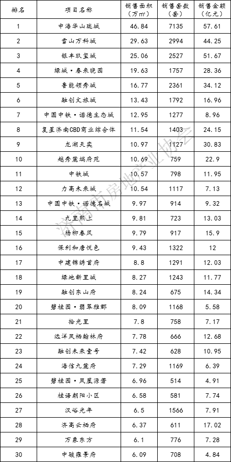 2023年1月17日,济南市房地产业协会发布2022年济南房地产市场运行情况及销售排行榜,内容如下: