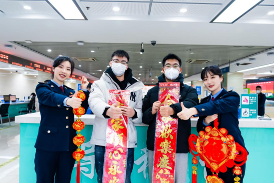 在各项业务有条不紊进行的同时,税务干部开展送“福”活动,给前来办理的纳税人缴费人送上自制春节主题挂饰,焕新楹联,送上祝福,介绍2023年“便民办税春风行动”首批办税缴费举措,畅谈新的一年美好愿景。