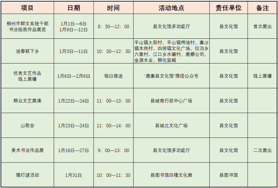 为丰富春节期间广大人民群众的文化生活,在全县营造欢乐祥和的新春氛围,弘扬中华传统文化,持续推进“文化惠民”活动普及,让全县人民度过一个欢乐、祥和、喜庆、文明的新春佳节,我县定于2023年春节期间举办系列文化活动。具体安排如下: