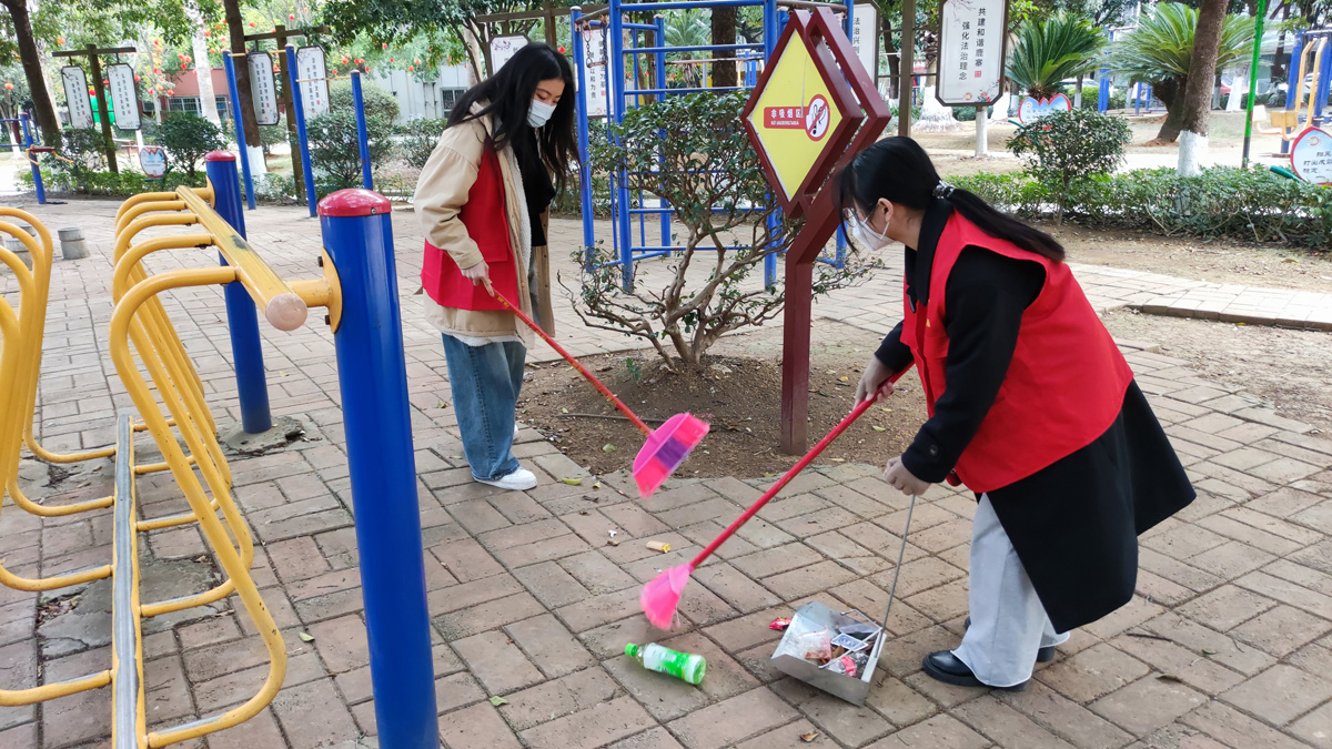 志愿者们身着红马甲,手持垃圾袋、铁夹和扫帚等工具,发扬不怕苦、不怕累的精神,对公园各处进行全面清扫。他们团结协作,互帮互助,非常默契,虽然累在其中,但在他们的共同努力下,主题公园的卫生环境焕然一新。