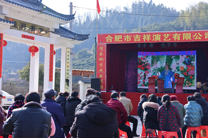 正月初四,阳光和煦,在晓天镇独山村余河组,村民们正兴致勃勃地观看着传统庐剧《花好月圆》。给他们送来这场演出的是本组在外创业人士余帮俊。