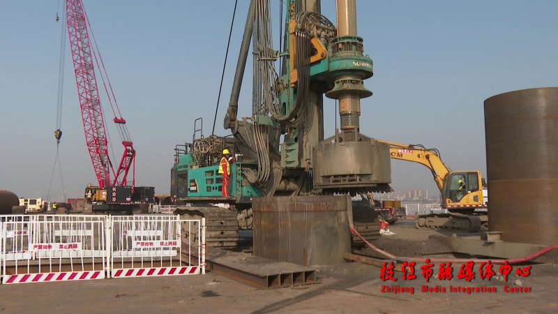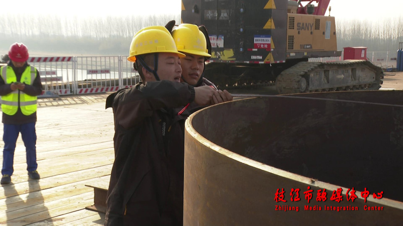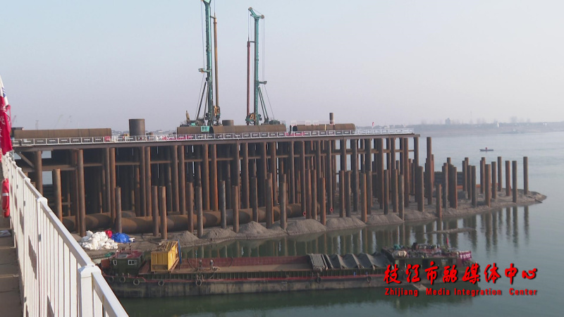 1月19日,记者来到位于百里洲镇白马寺村的枝江长江大桥南侧主桥墩建设所在地看到,从大堤堤顶至江心桥墩的一条长420米、宽9米的施工栈桥已修建完毕投入使用。赛过足球场面积的江心钢架平台上机器轰鸣,一台大型的钻机将巨大的钻头伸进钢护筒内垂直向地下掘近;与此同时,一台大型吊机吊着一段钢护筒精准地完成接续,工人们紧接着细致地进行焊接,现场呈现一片紧张有序的施工景象。
