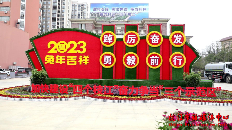 枝江市园林绿化中心北站广场养护股股长覃素滔介绍:“目前在枝江广场、五柳公园、东干渠大道设置三处主题绿雕,摆放报春、雏菊、杜鹃等鲜花5万钵,并对胜利路、马店路、民主大道、东干渠大道上的重点段面实施亮化添彩,点亮行道树580余株、桥涵3座,同时在重要节点布置了流星雨灯串,营造火树银花、流光溢彩的兔年新春景致。”