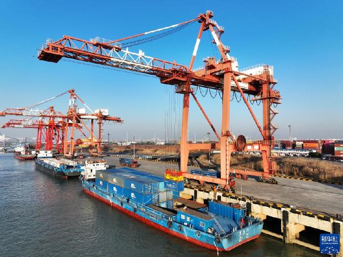 1月28日,货轮在江苏省扬州港集装箱码头进行集装箱装卸作业(无人机照片)。