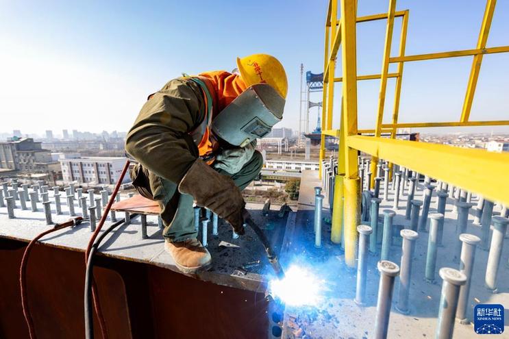 1月28日,在位于河北省石家庄市栾城区的中车齐车集团石家庄公司,车间员工进行焊接操作。