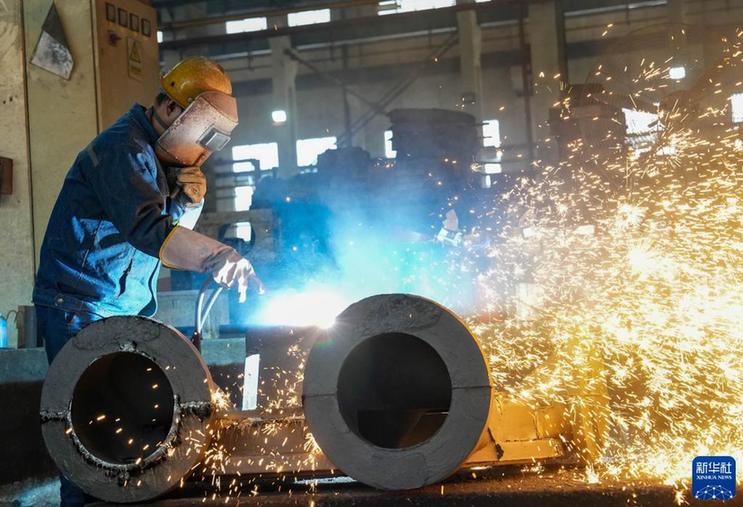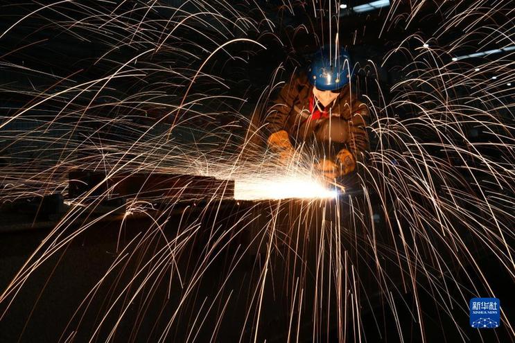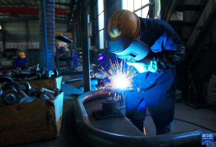 1月28日,工人在山东省临沂市平邑县地方镇一家健身器材生产企业车间内焊接钢材。