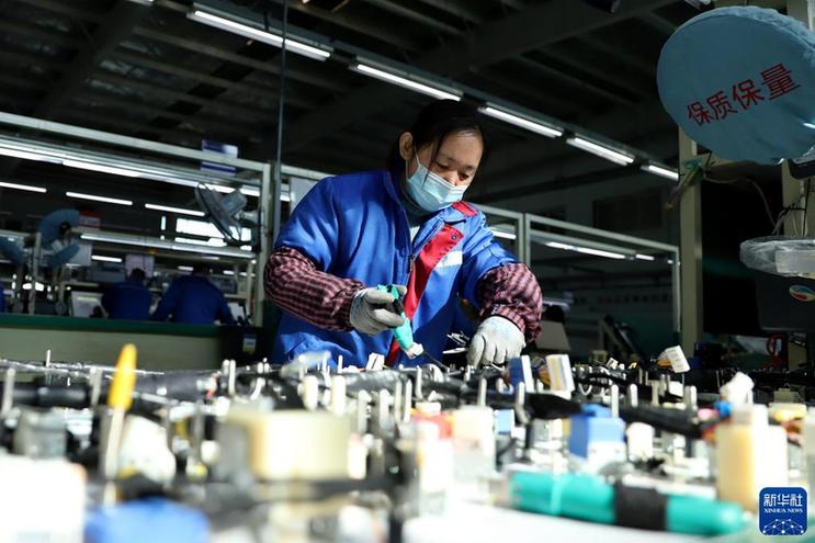1月28日,山东省临沂市郯城县郯城街道一家电子企业的工人在生产线上工作。