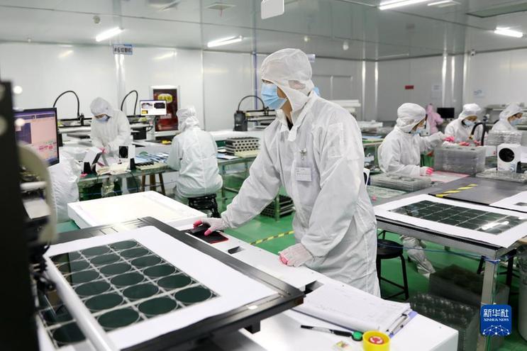 1月28日,工人在安徽省合肥市肥东县合肥循环经济示范园内某太阳能光伏组件生产公司的车间作业。