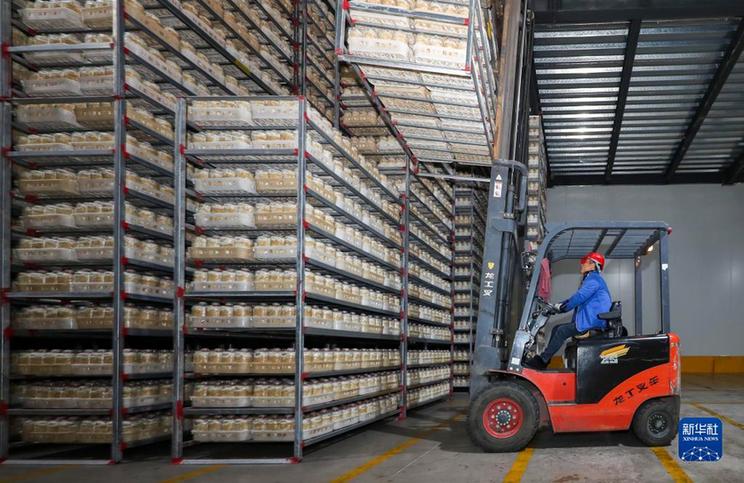 1月28日,在山东省青岛西海岸新区一家企业仓库内,工人进行装车作业。